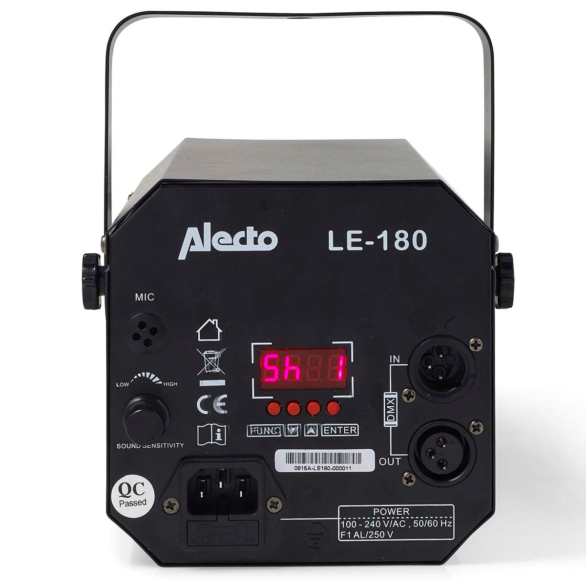 Die LE-180 kann die Geschwindigkeit an die Umgebungsgeräusche anpassen Auf der Rückseite der Discolampe können Sie die Empfindlichkeit des Sensors selbst einstellen.