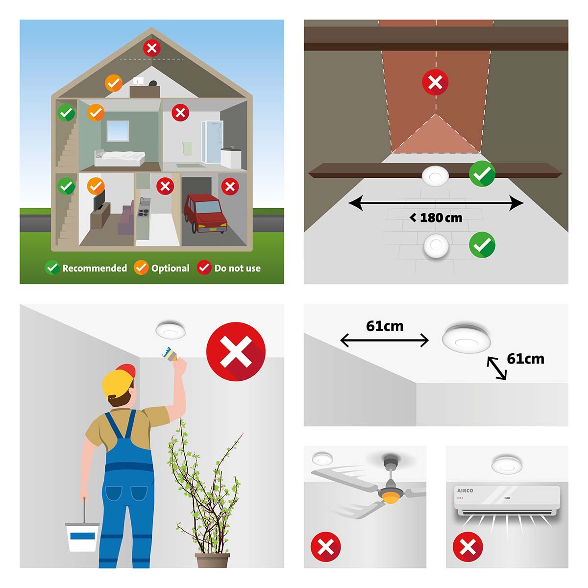 Die besten Orte für die Platzierung von Rauchmeldern sind im Flur oder auf dem Treppenabsatz. Diese sind oft die Fluchtwege im Haus, wenn ein Feuer ausbricht. Wenn Sie maximalen Schutz wünschen, hängen Sie in jedem Raum, in dem ein Feuer entstehen kann, einen Rauchmelder auf.