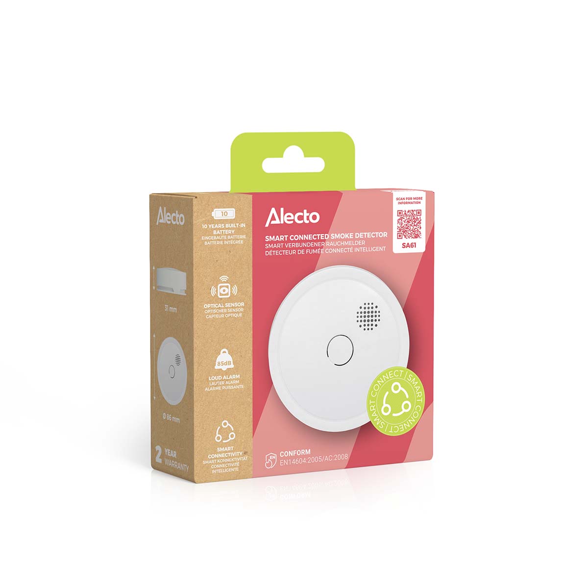 Der Rauchmelder Alecto SA61 kann drahtlos mit anderen Rauchmeldern verbunden werden, was für einen zusätzlichen Brandschutz sorgt. Ihre Umgebung ist optimal geschützt, denn wenn ein Rauchmelder Rauch oder Feuer erkennt, schlagen auch alle anderen angeschlossenen Rauchmelder Alarm. Dieser Rauchmelder, der kabellos vernetzt werden kann, verfügt über eine Batterie und einen optischen Sensor, die beide 10 Jahre halten. Mit dem SA61 haben Sie 10 Jahre lang die Gewissheit, Ihre Umgebung abgesichert zu haben. Und natürlich entspricht dieser Rauchmelder den höchsten europäischen Zertifizierungen und Anforderungen.