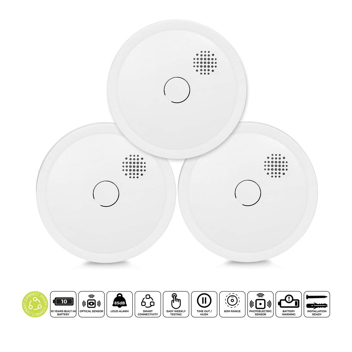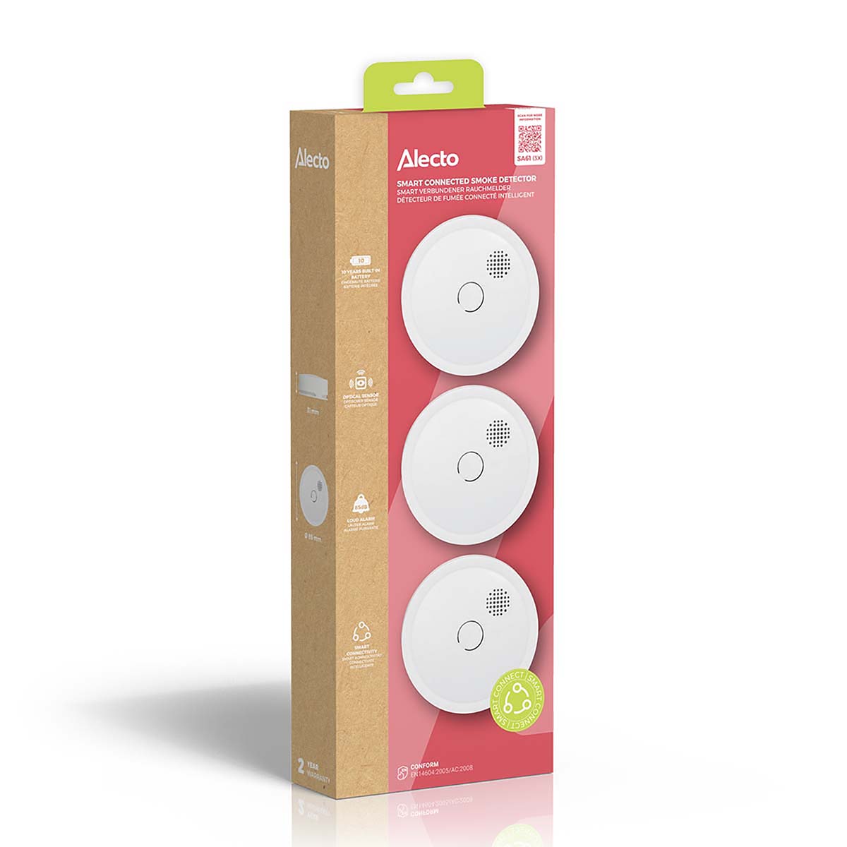 Der Alecto SA61 3X ist ein Set aus drei Rauchmeldern (Typnummer SA61), die drahtlos miteinander gekoppelt werden können. Dies sorgt für zusätzliche Brandsicherheit. Ihre Umgebung ist optimal geschützt, denn wenn ein Melder Rauch oder Feuer erkennt, lösen alle gekoppelten Rauchmelder Alarm aus. Dieser drahtlos koppelbare Rauchmelder verfügt über eine Batterie und einen optischen Sensor mit einer Lebensdauer von jeweils 10 Jahren. Mit dem SA61 3X sind Sie 10 Jahre lang auf eine sichere Umgebung eingestellt. Selbstverständlich erfüllt dieser Rauchmelder die höchsten europäischen Prüfungen und Anforderungen.