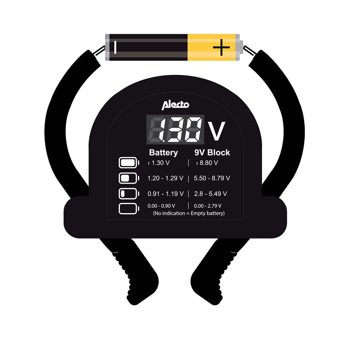 Alecto BTT2 - Kompakter universeller Batterietester für AA, AAA, C, D und 9V Batterien - Schwarz