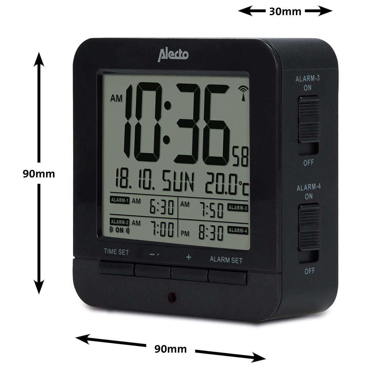 Auf dem Display dieses Weckers können Sie eine Vielzahl von Informationen ablesen. Beginnend mit der Uhrzeit, die in Stunden, Minuten und Sekunden angezeigt wird; auf die Millisekunde genau dank der DCF-gesteuerten Uhr. Darunter das Datum, der Tag und die Temperatur. Und darunter die Alarmzeiten, die Sie eingestellt haben. Sie können bei diesem Wecker mit Temperatur insgesamt vier Weckzeiten einstellen. Sehr praktisch für Sie und Ihren Partner, bei unregelmäßigen Arbeitszeiten, am Wochenende, usw.