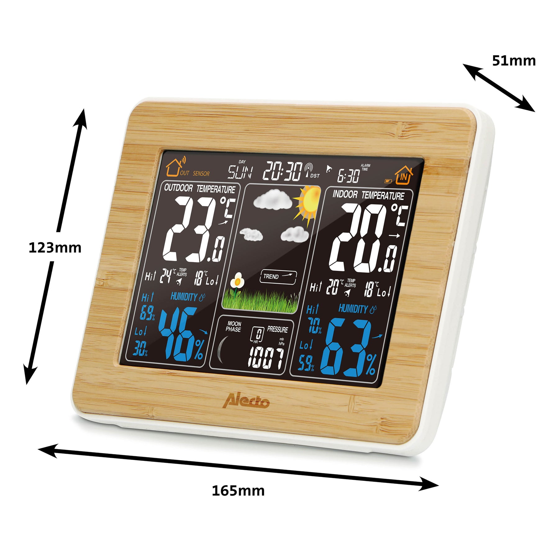 Messen Sie die Temperatur, Luftfeuchtigkeit und den Niederschlag mit der Alecto WS-1560 Bambus-Wetterstation. Die Wetterstation mit drahtlosem Außensensor misst sowohl Innen- als auch Außentemperatur und Luftfeuchtigkeit.
