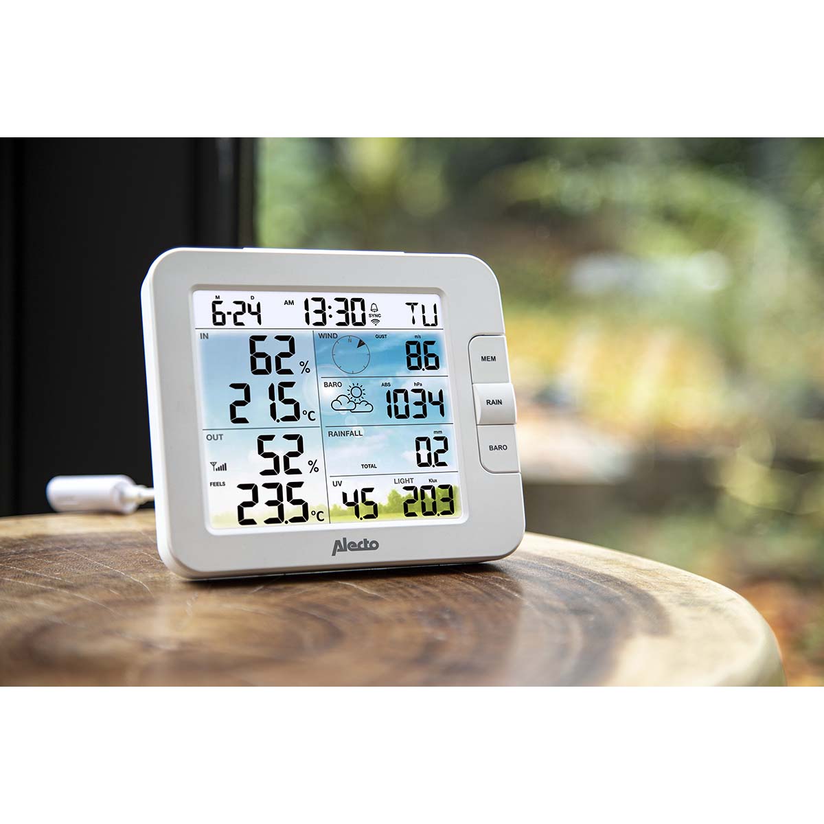 Außer der App steht Ihnen zum Ablesen der aktuellen Wetterdaten auch das attraktive Farbdisplay (Durchmesser 4,8 Zoll / 12,3 cm) zur Verfügung. Die Alecto WS5400 gibt nicht nur die Uhrzeit und das Datum an, sondern auch einen klaren Überblick über historische Daten und erstellt auf der Grundlage all dieser Daten sogar Wettervorhersagen.